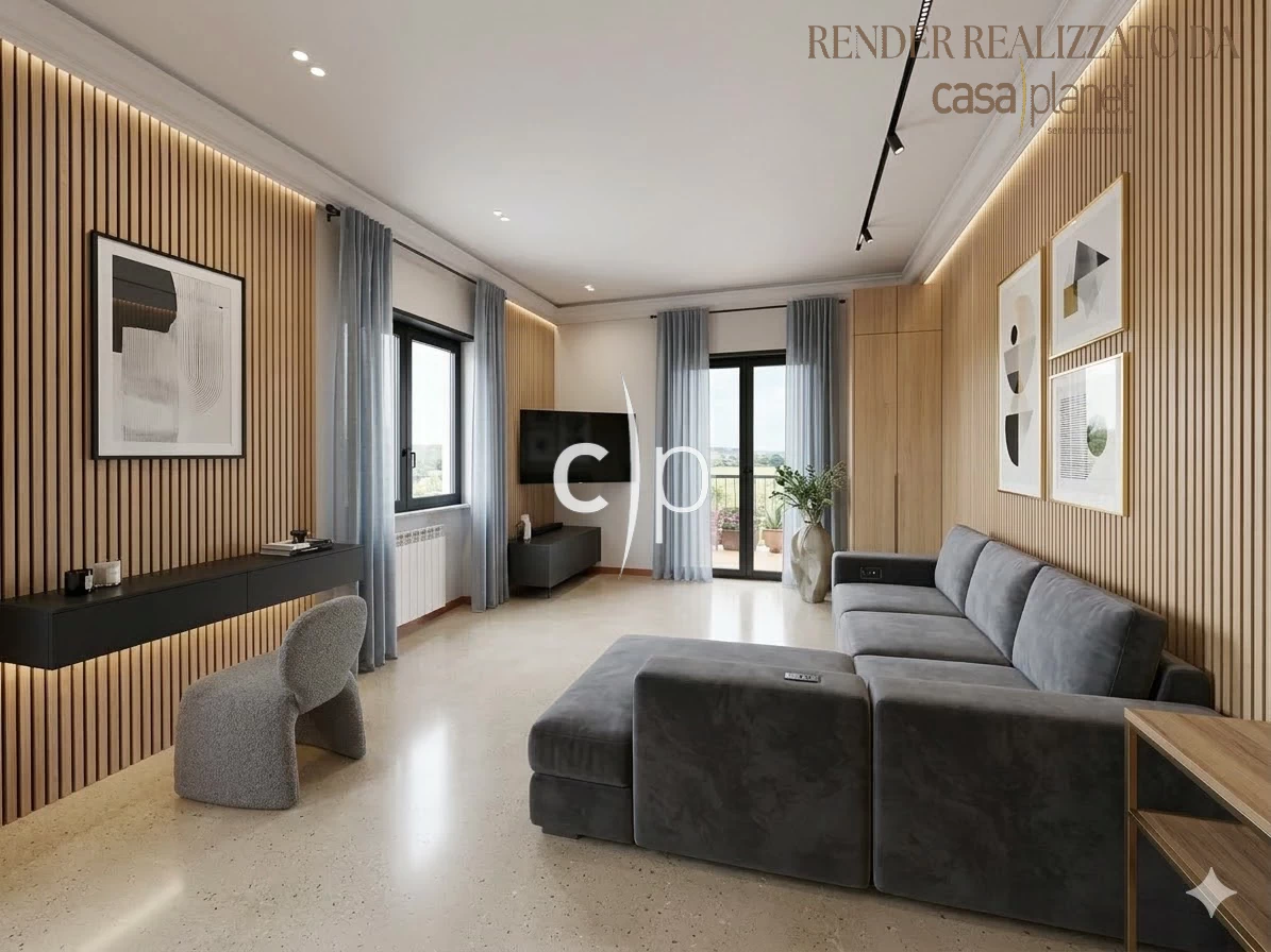 • Primo piano: pavimenti in cotto, infissi in PVC effetto legno con doppio vetro e zanzariere, climatizzazione nel salone e nelle camere, armadi a muro.